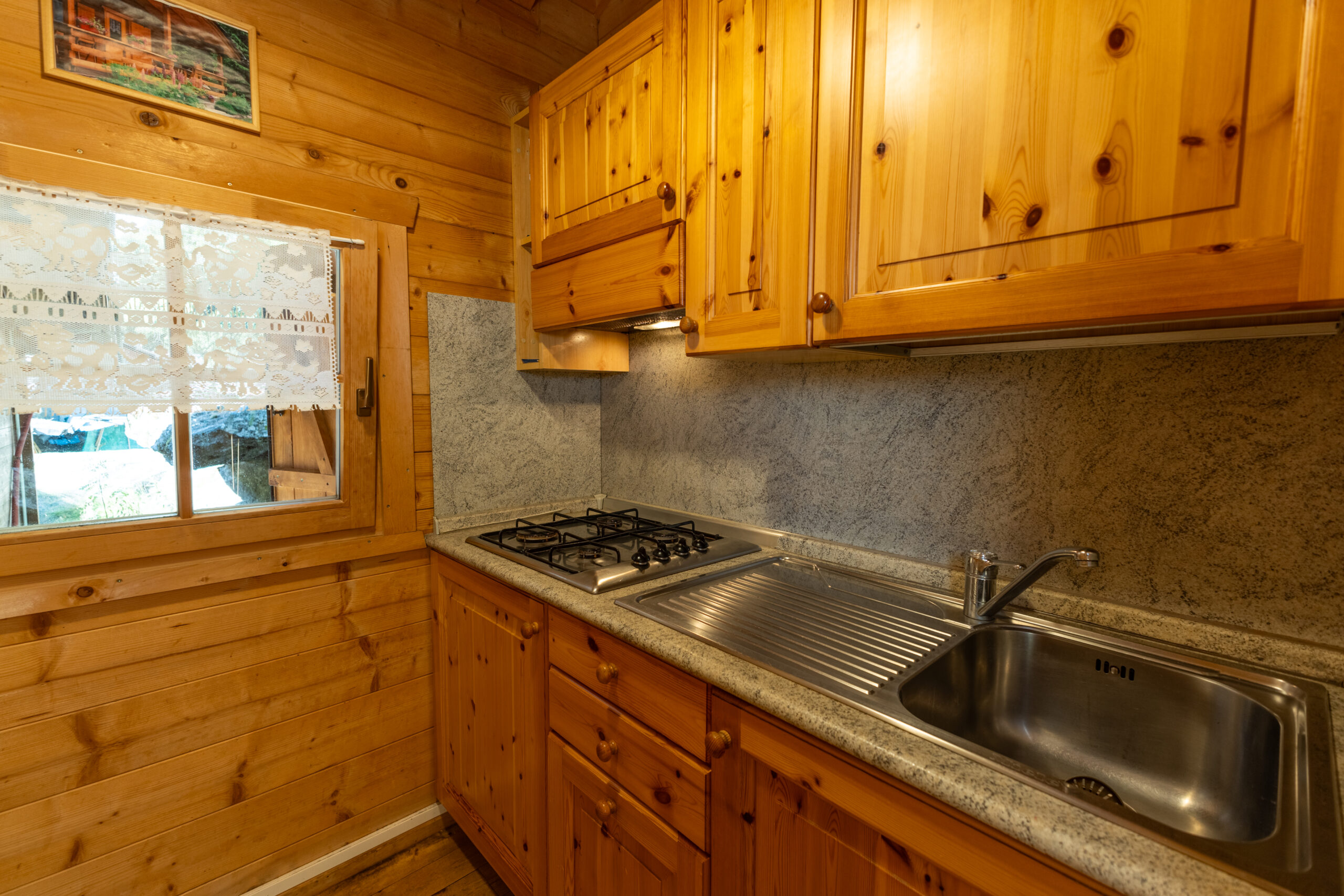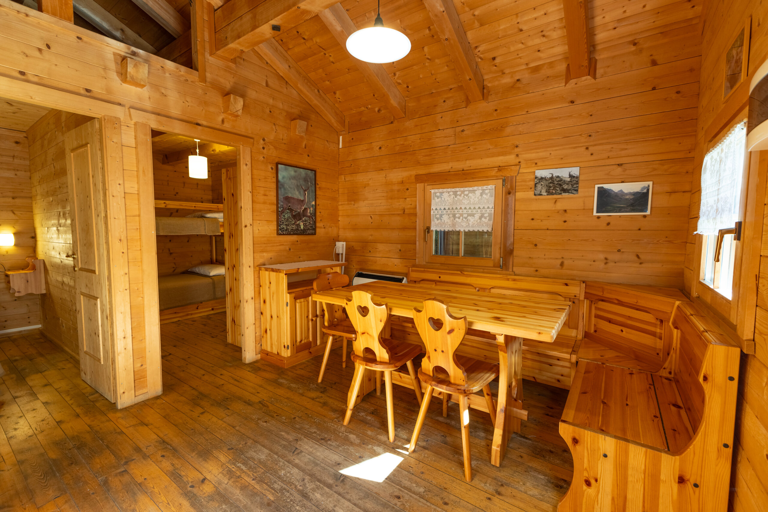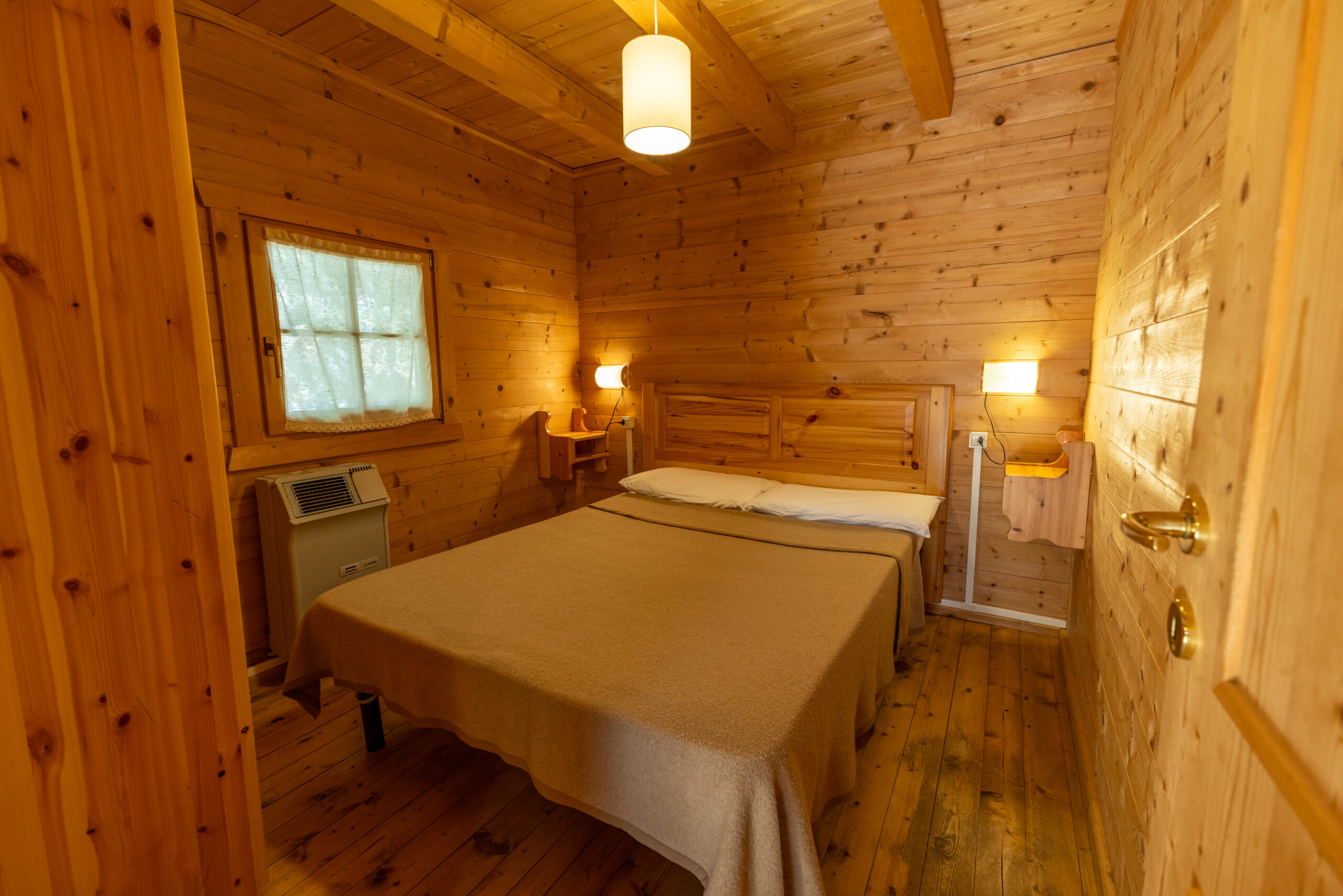 The chalets, equipped with heating system, can accommodate up to 5 people and consist of a living room with equipped kitchen, a double bedroom, a bedroom with bunk bed and third pull-out bed. They are completed by the bathroom with shower and the private terrace.