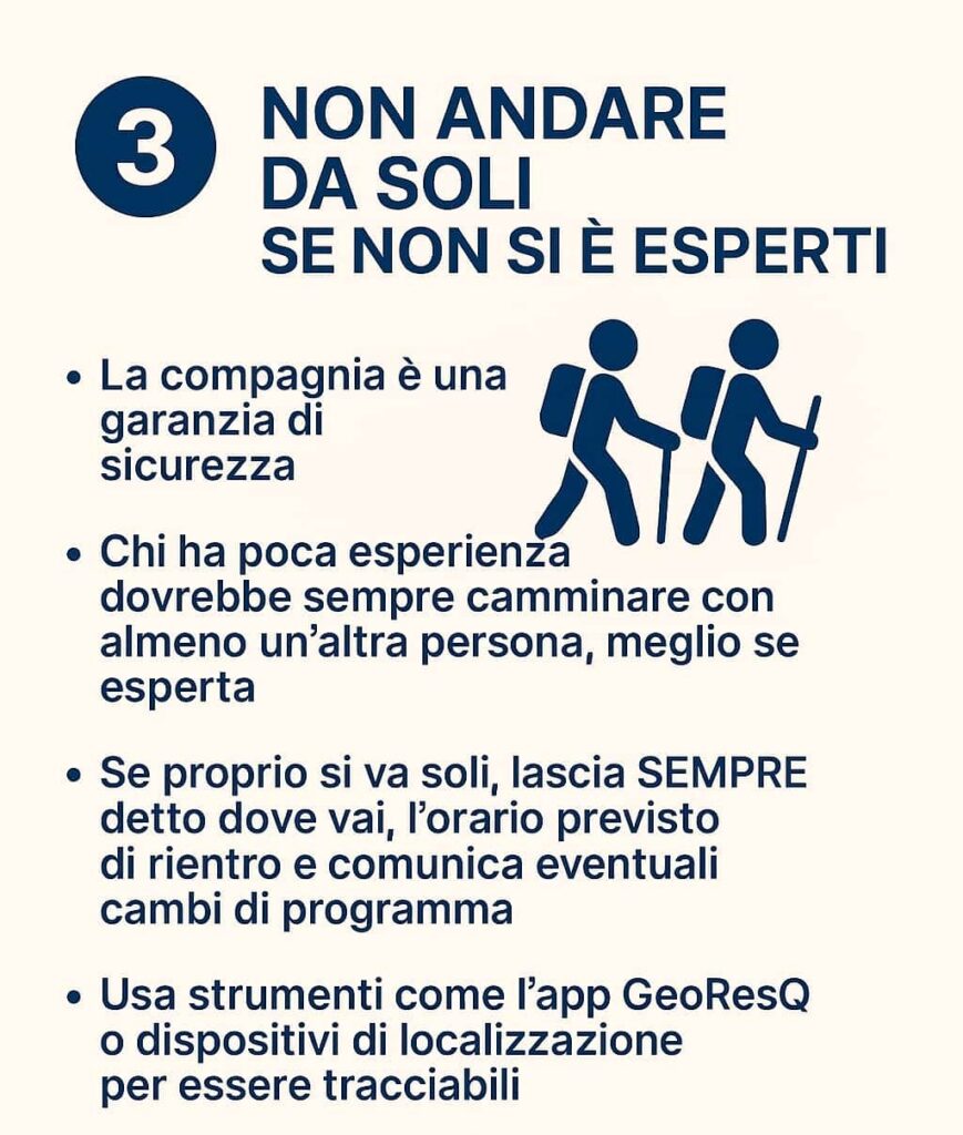 Non andare da soli se non si è esperti. Essere in compagnia, soprattutto di una persona esperta, è garanzia di sicurezza. E se proprio si decida di andare da soli, mai dimenticare di comunicare a qualcuno la propria destinazione, l’orario previsto di rientro ed eventuali cambi di programma. Buona norma è anche utilizzare App o dispositivi di localizzazione, per essere rintracciabili.